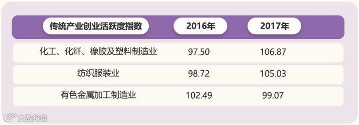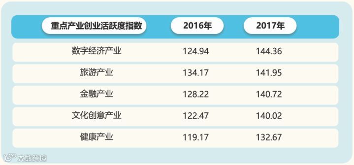创业活跃度指数,数字经济、旅游、金融产业遥遥领先,分别达到144.36点、141.95点、140.72点,化工、化纤、橡胶及塑料制造业高于纺织服装业,有色金属加工制造业呈下降趋势。