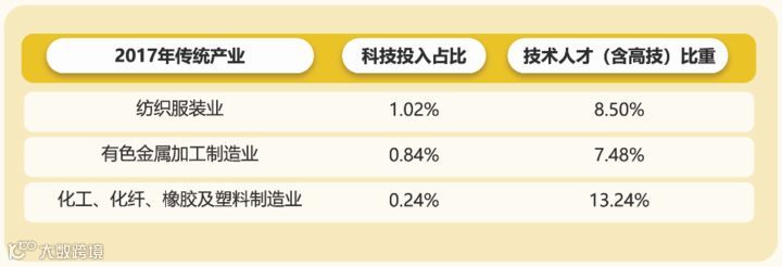 科技投入和专业技术人才使用,数字经济产业最为重视,传统产业中,纺织服装业科技投入占比最高,化工、化纤、橡胶及塑料制造业技术人才(含高技)最高。