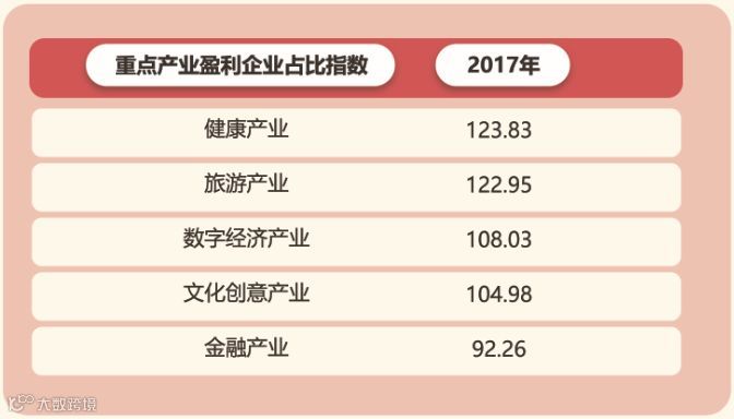 盈利企业占比指数,重点产业中,健康产业最高,金融产业最低,传统产业中,化工、化纤、橡胶及塑料制造业在传统产业中盈利企业占比最高。