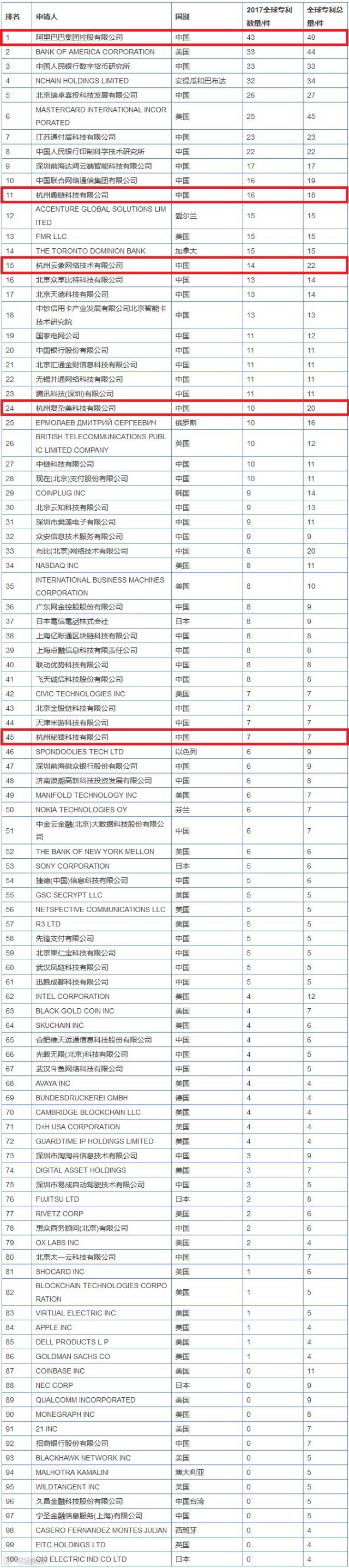 2017年,除了获得43项专利、排名全球第一的阿里巴巴外,还有杭州趣链科技、杭州云象网络、杭州复杂美科技、杭州秘猿科技,总共5家企业上榜。