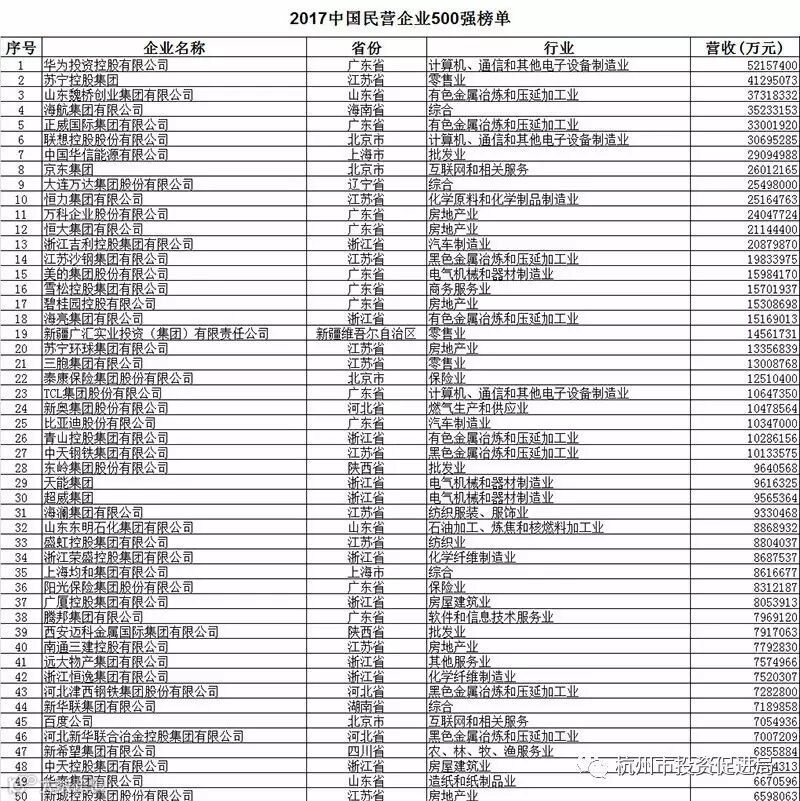 2017中国民营企业500强前三名:华为投资控股有限公司、苏宁控股集团、山东魏桥创业集团有限公司;