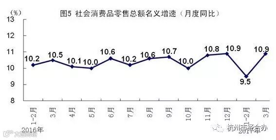 一季度,社会消费品零售总额85823亿元,同比增长10.0%,增速比上年全年回落0.4个百分点。其中,限额以上单位消费品零售额37460亿元,增长7.9%。按经营单位所在地分,城镇消费品零售额73398亿元,增长9.7%;乡村消费品零售额12426亿元,增长11.9%。按消费类型分,餐饮收入9196亿元,增长10.8%;商品零售76627亿元,增长9.9%,其中限额以上单位商品零售35248亿元,增长7.9%。消费升级类商品增长较快,文化办公用品增长14.8%,通讯器材增长11.0%,体育娱乐用品类增长17.3%,家具增长12.6%,建筑及装潢材料增长14.8%。3月份,社会消费品零售总额同比增长10.9%,比1-2月份加快1.4个百分点,环比增长0.84%。