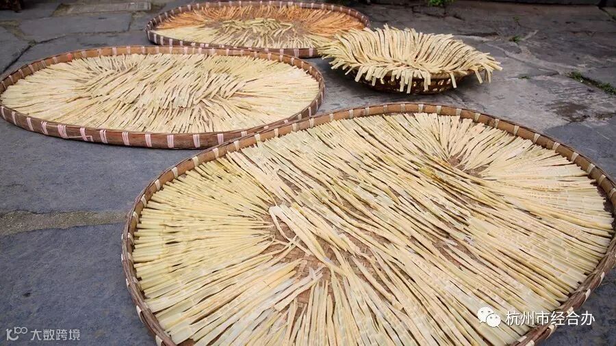 剥好的野竹笋经过清洗,切成丝条,整齐的摊在同样用竹子制成的簸箕里晾晒。