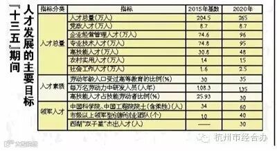 日前,市政府办公厅印发《杭州市人才发展“十三五”规划》。《规划》中提到,到2020年,全市人才总量力争达到265万人左右,主要劳动年龄人口受过高等教育的比例达到35%,引进(含柔性)中国科学院、中国工程院院士25名左右,培养引进国内外文化文艺大师20名左右,培养引进国内知名企业家50名左右。特别提到要培育西湖“双子星”杰出人才30名左右,西湖“双子星”人才为市级高端创新创业领军人才,将是致力于杭州经济社会转型发展关键领域、引领杭州未来发展的顶尖创新创业领军人才,分“创新之星”和“创业之星”。