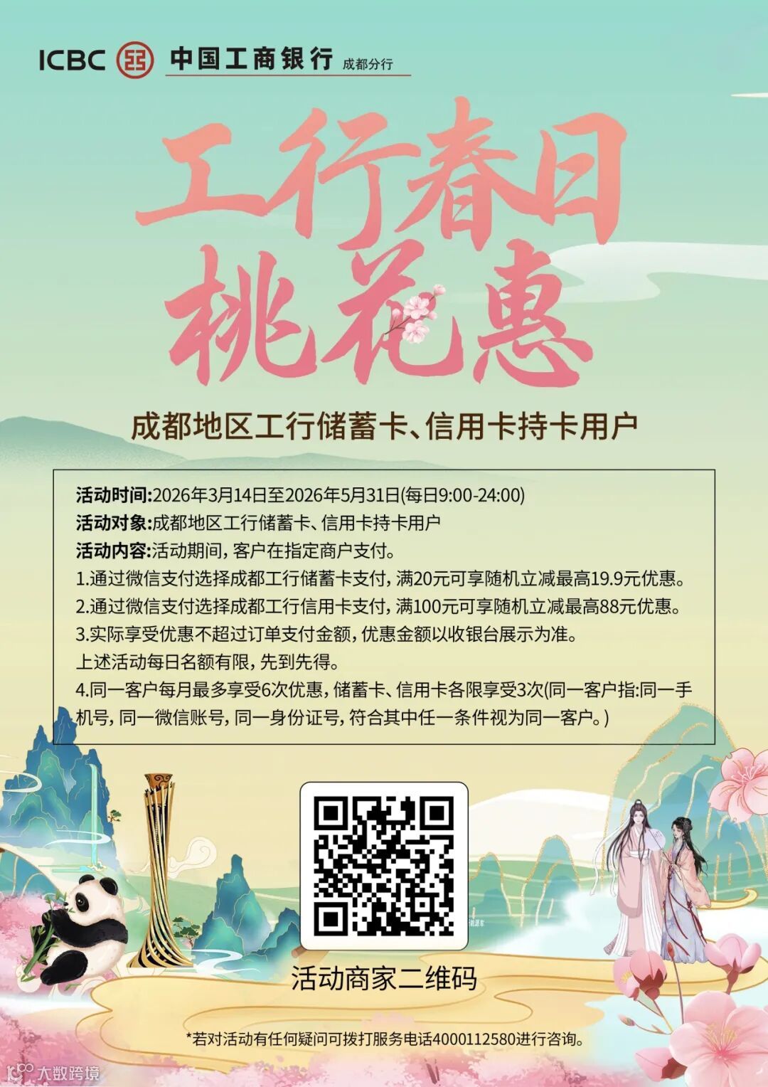 这场桃花盛会,不仅有漫山桃色,更藏着满满惠民诚意。工商银行(龙泉驿支行)与龙泉驿区文体旅商产业联盟联合开发宣传小程序,并聚焦特色商户,投入百万元专项资金,推出支付立减、满减等惠民活动,引流促消费,实现政银联动,以金融力量赋能文旅产业发展。