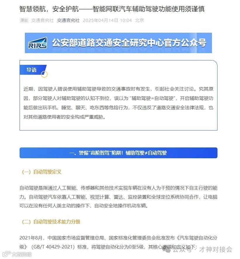 近日,公安部道路交通安全研究中心官方微信公众号“交通言究社”发表《智慧领航,安全护航——智能网联汽车辅助驾驶功能使用须谨慎》一文,将智能网联汽车辅助驾驶功能使用安全问题再次拉回大众视野。因驾驶人错误使用辅助驾驶导致的交通事故频发,背后的一大“元凶”便是车企对辅助驾驶功能的夸大宣传。