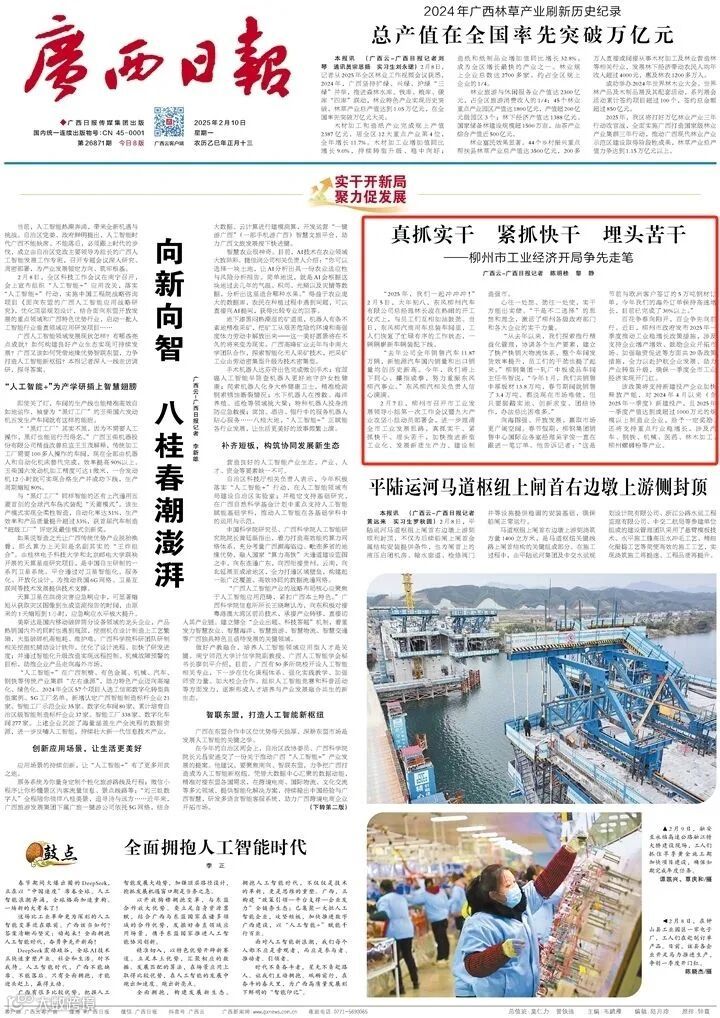 2月10日,《广西日报》头版刊发报道《真抓实干 紧抓快干 埋头苦干——柳州市工业经济开局争先走笔》。其中提到,2月7日,柳州市召开市工业发展领导小组第一次工作会议暨九大产业攻坚小组动员部署会,进一步理清全市工业发展思路,真抓实干、紧抓快干、埋头苦干,加快推进新型工业化、发展新质生产力、建设制造强市。“干是不二选择”的思想和理念,激活了柳州各级政府部门和各大企业的实干力量。