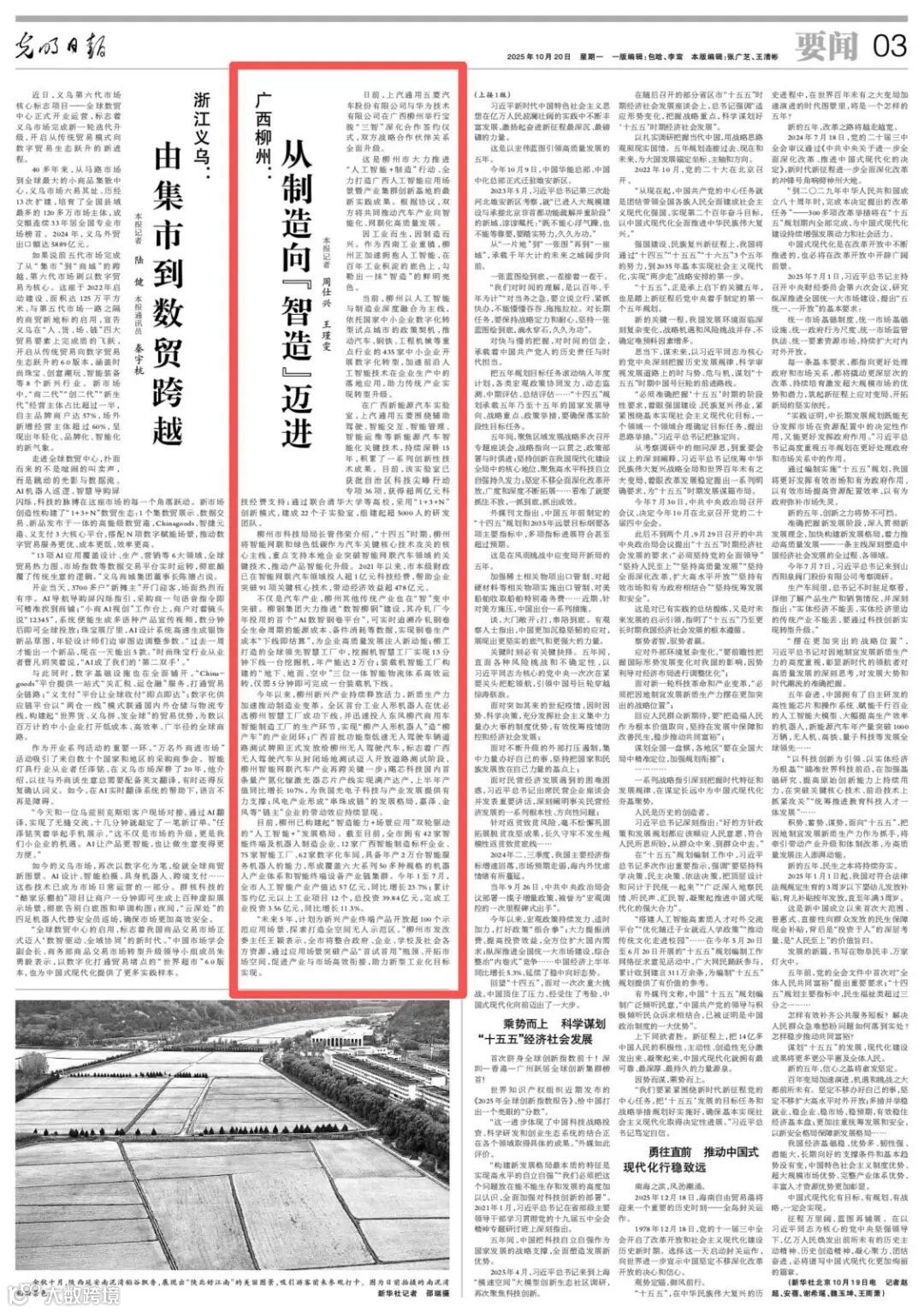 10月20日,《光明日报》第3版刊发《广西柳州:从制造向“智造”迈进》,报道称,当前,柳州以人工智能与制造业深度融合为主线,加速前沿人工智能技术在企业生产中的落地应用,助力传统产业实现转型升级。
