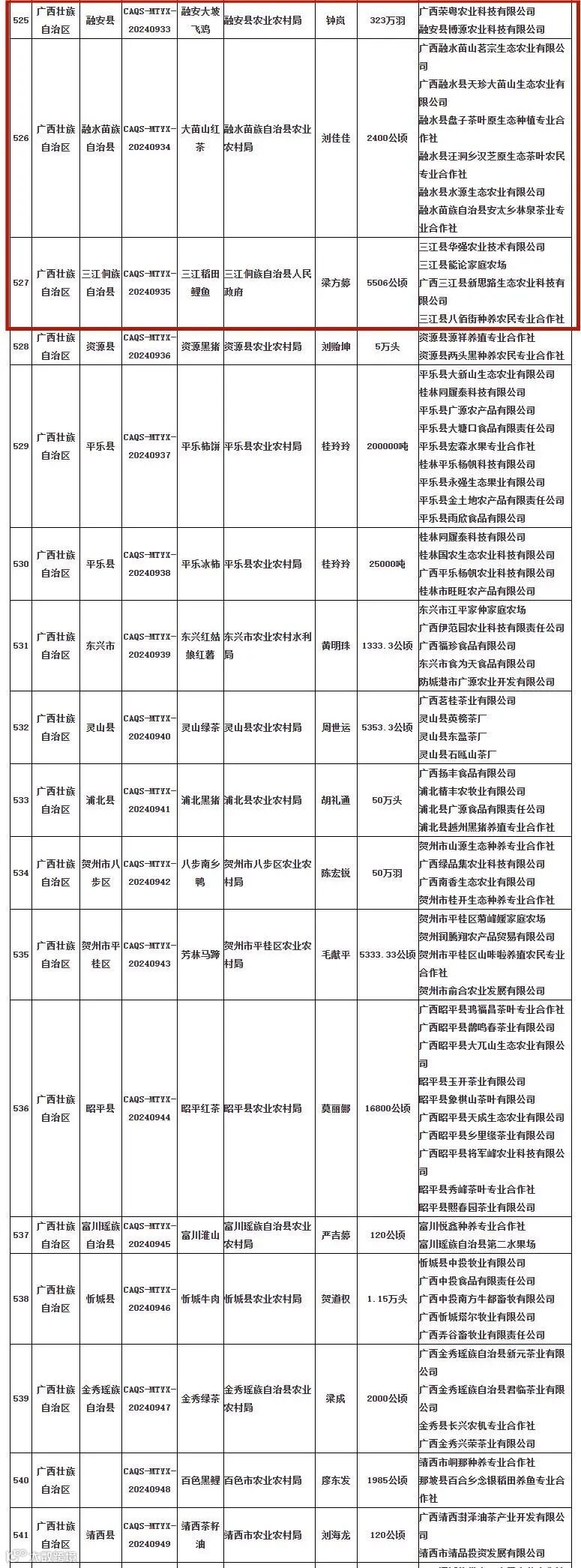 8月19日,农业农村部农产品质量安全中心发布2024年第二批全国名特优新农产品名录,全国共有737个产品入选。其中,广西有17个产品入选,柳州的融安大坡飞鸡、大苗山红茶、三江稻田鲤鱼共3个产品上榜。