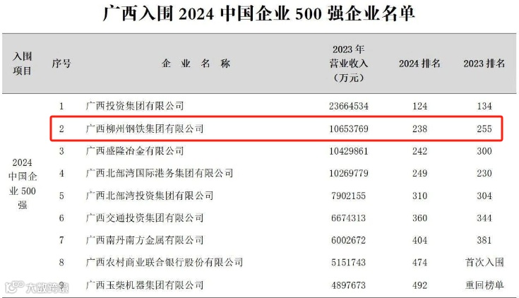 9月11日,中国企业联合会、中国企业家协会发布“2024中国企业500强”榜单。记者从广西企业与企业家联合会获悉,广西有9家企业上榜,较上年增加2家,上榜企业数创历史新高。其中,广西柳州钢铁集团有限公司位列榜单第238位,成为唯一登榜的柳州企业。