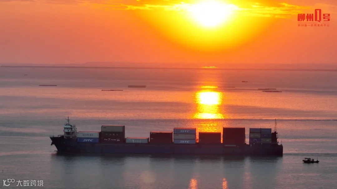 2024年12月16日,北部湾畔,霞光映红海面,一艘满载柳州货物的轮船从钦州港启航。(全媒体记者 黎寒池 摄)