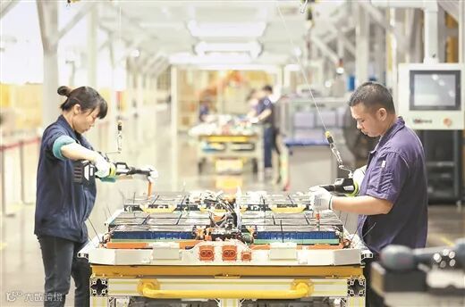 3月4日,在柳州国轩锂电池生产基地,工人正在组装新能源汽车电池包。石 峰/摄