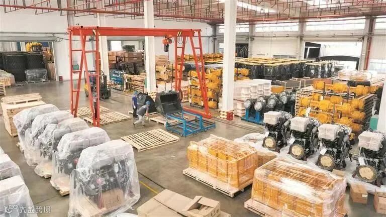 8月5日,工人在仓库里装运即将出口的工程机械产品。