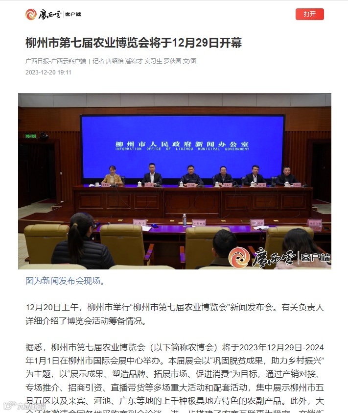 12月20日上午,柳州市举行“第七届柳州市农业博览会”新闻发布会。有关负责人详细介绍了博览会活动筹备情况。