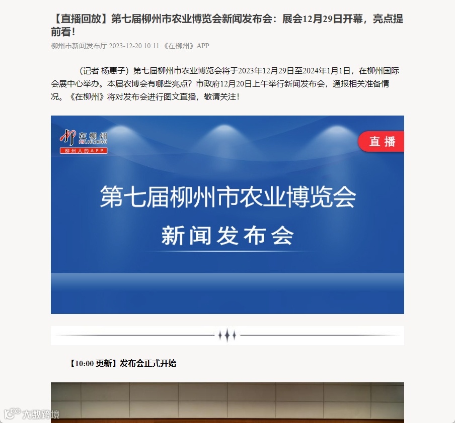 第七届柳州市农业博览会将于2023年12月29日至2024年1月1日,在柳州国际会展中心举办。本届农博会有哪些亮点?市政府12月20日上午举行新闻发布会,通报相关准备情况。《在柳州》将对发布会进行图文直播,敬请关注!