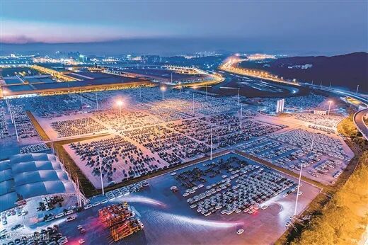 夜幕下,柳州市柳东新区的上汽通用五菱汽车股份有限公司宝骏基地成品库,一批成品车正在装载外运。李斌/摄