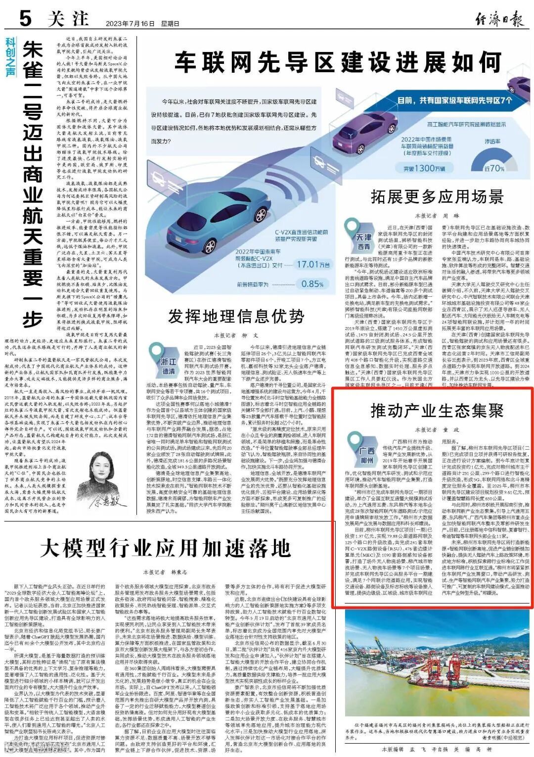 与此同时,柳州市积极开展招商引资,推动车联网新产业生态聚集。引导上汽通用五菱、东风柳汽、广西汽车集团等柳州市重点企业加快智能网联汽车整车及零部件研发生产。目前,已注册落地中信科智联、复睿智行、希迪智驾等车联网头部企业11家。