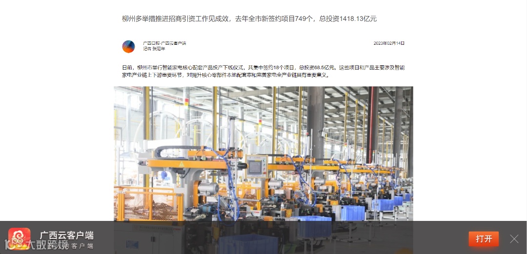 日前,柳州市举行智能家电核心配套产品投产下线仪式,共集中签约18个项目,总投资68.5亿元。这些项目和产品主要涉及智能家电产业链上下游重要环节,对提升核心零部件本地配套率和完善家电全产业链具有重要意义。