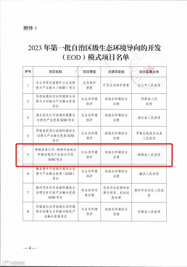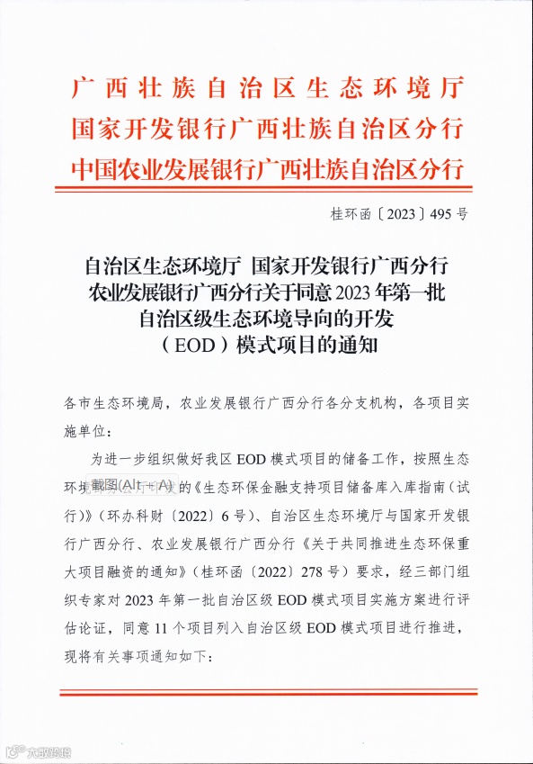 近日,自治区生态环境厅、国家开发银行广西分行、农业发展银行广西分行联合公布2023年第一批自治区生态环境导向的开发EOD模式项目名单,柳州市柳城县保大河、杨柳河流域水环境治理及产业综合开发EOD模式项目成功获批入库,为柳州市探索生态产品价值实现路径迈出新步伐。