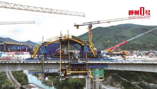 桂林至柳州高速公路改扩建项目翁村一号大桥上进行的合龙施工现场