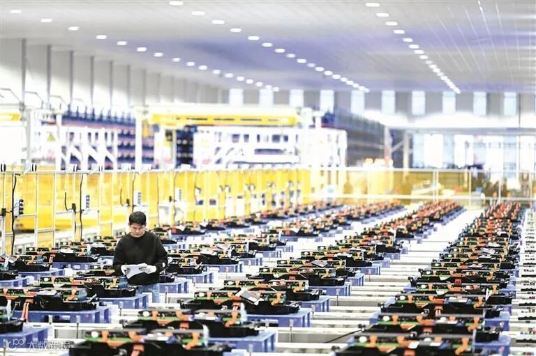 在柳州国轩锂电池生产基地,工人检查正在组装的新能源汽车电池包。