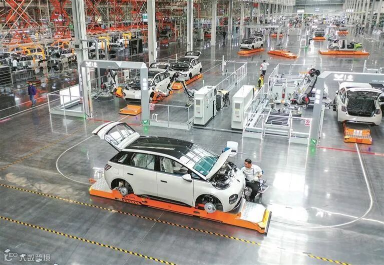 记者在工厂内看到,一辆辆待组装的新能源汽车“踩”着滑板车,穿梭在一个个“岛”之间,从开始组装到驶出生产线,每一步的零部件组装都由机器人完成。