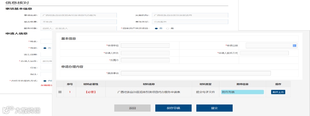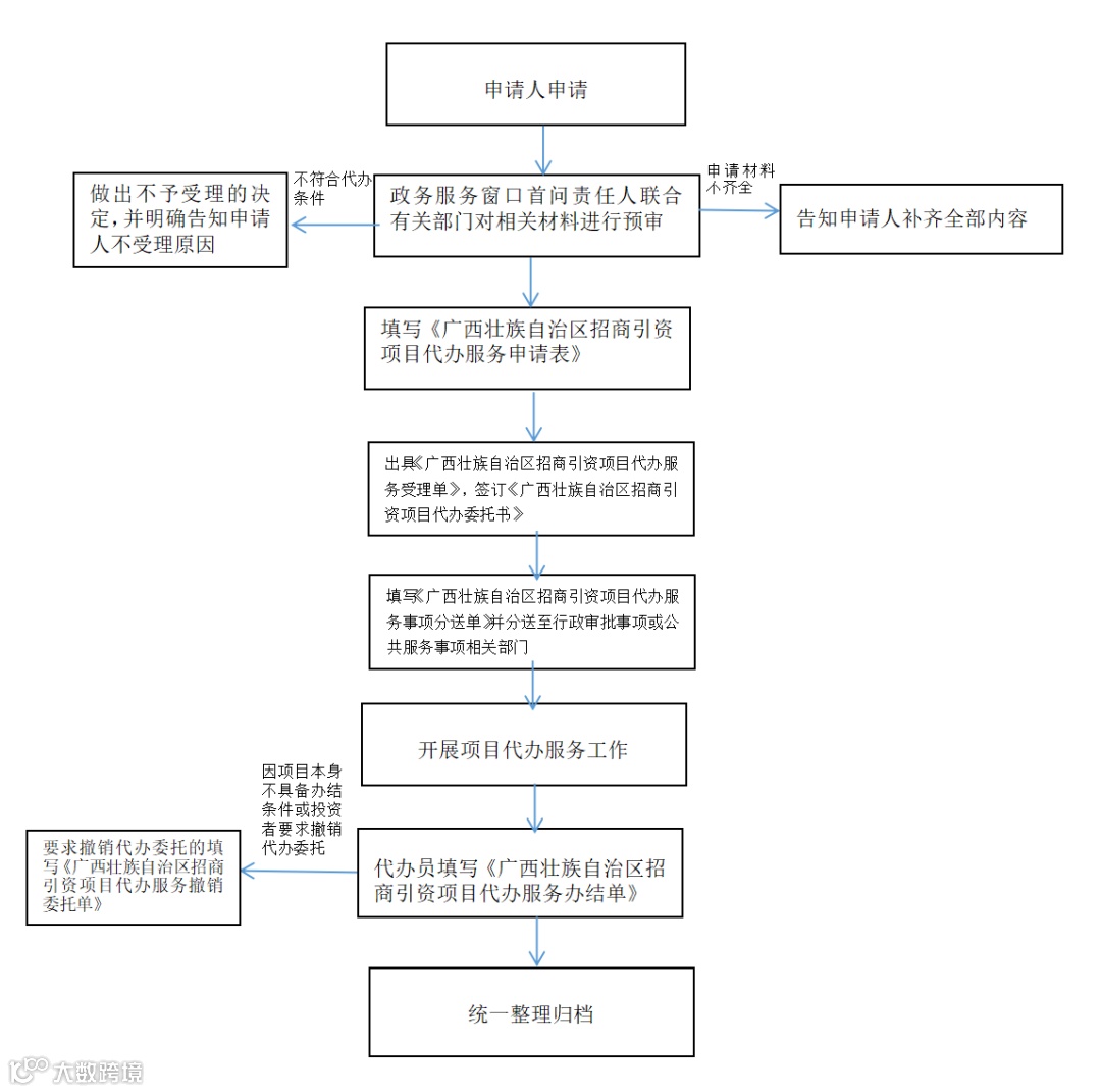 2. 申请材料:具体参阅《广西壮族自治区投资促进委员会办公室关于印发〈广西壮族自治区招商引资项目代办服务工作机制〉和〈广西壮族自治区招商引资项目代办服务工作暂行办法〉的通知》(桂投促委办发〔2019〕2号)执行。