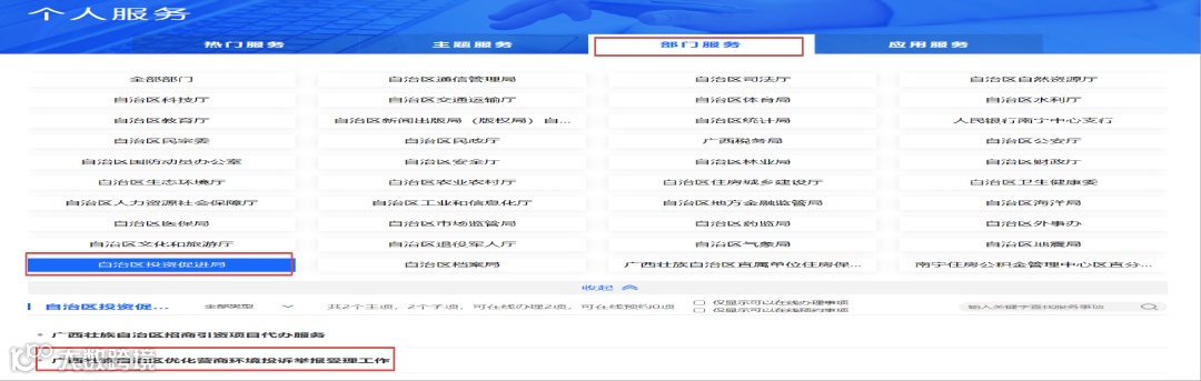 ●点击“部门服务”——“自治区投资促进局”——“广西壮族自治区优化营商环境投诉举报受理工作”。