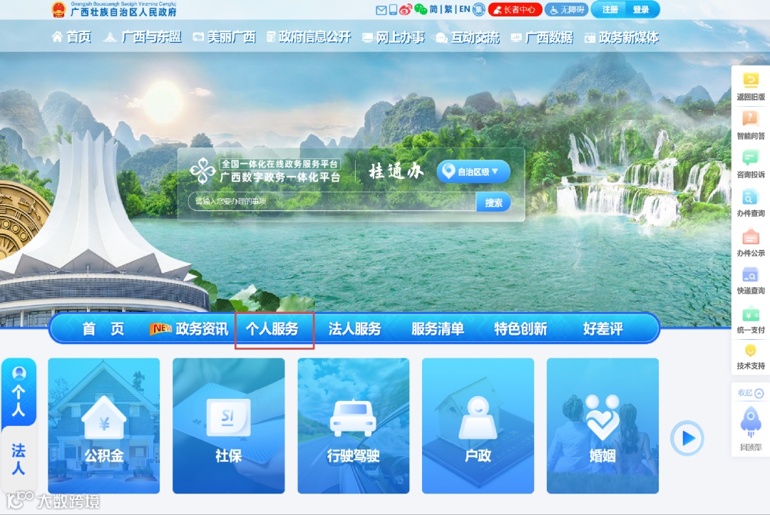 ●登录“广西数字政务一体化平台”(http://zwfw.gxzf.gov.cn/)点击个人服务。