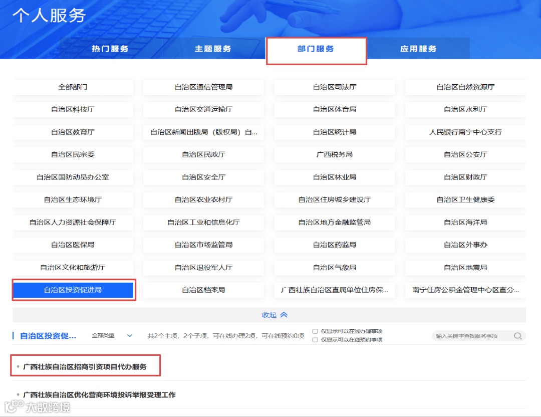 ●点击“部门服务”——“自治区投资促进局”——“广西壮族自治区招商引资项目代办服务”。