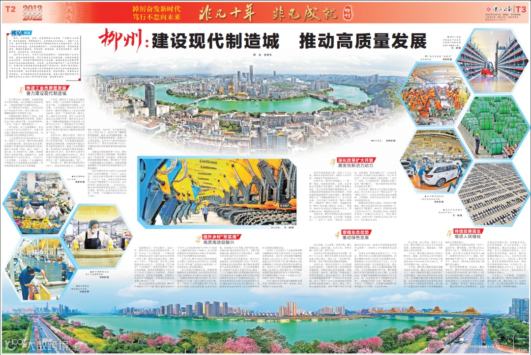 党的十八大以来,柳州市牢记嘱托、感恩奋进,深入实施“实业兴市,开放强柳”,持续推进建设广西面向东盟国际大通道的核心枢纽、面向西南中南地区开放发展新的战略支点的实业引擎、“一带一路”有机衔接重要门户的开放高地“三大建设”,加快建设现代制造城、打造万亿工业强市,向世人展示了一幅幅和谐壮阔的动人画卷。