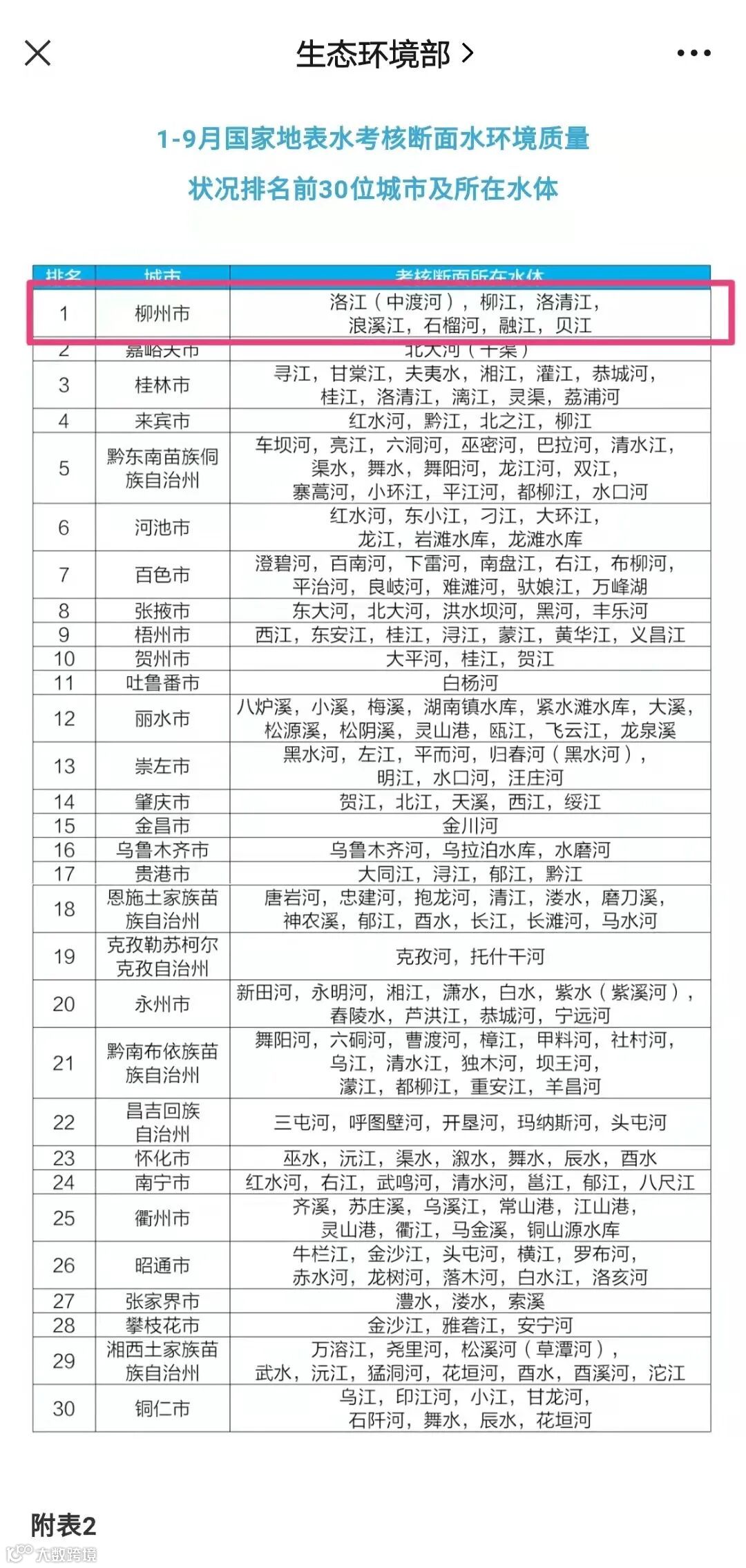 柳州全国第一!生态环境部10月18日通报了2021年9月和1~9月全国地表水、环境空气质量状况,柳州地表水质继续霸住榜首位置,领先全国300多个地级市。