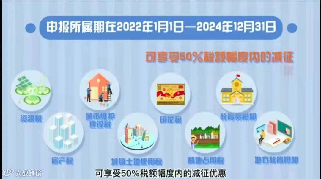 增值税小规模纳税人,小型微利企业和个体工商户的亲们,您申报所属期在2022年1月1日至2024年12月31日的以下税费可在50%的税额幅度内减征。