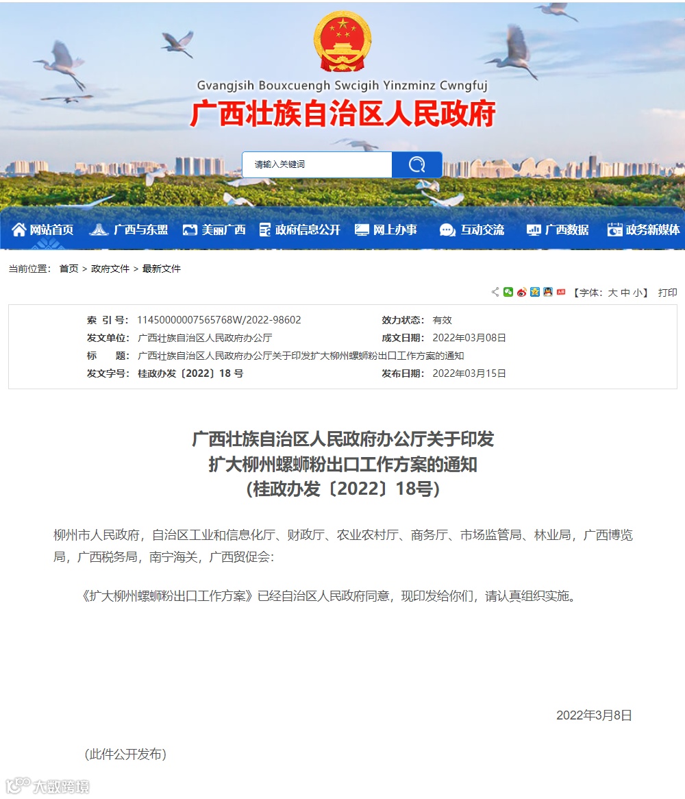 3月15日,自治区政府办公厅发布《扩大柳州螺蛳粉出口工作方案》(以下简称《方案》),明确提出,为深入贯彻落实习近平总书记视察柳州螺蛳粉生产集聚区的重要讲话和重要指示精神,以柳州市为重点培育壮大柳州螺蛳粉产业规模,推动柳州螺蛳粉产业迈向高端化、国际化,提升柳州螺蛳粉出口质量,扩大柳州螺蛳粉出口规模。