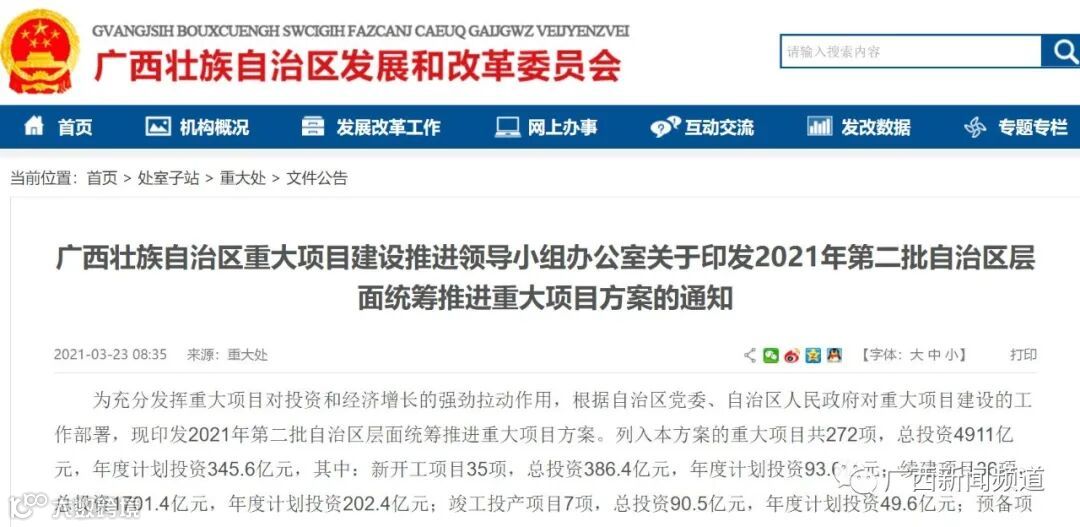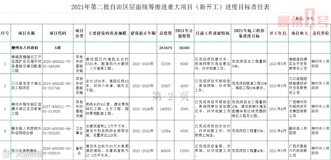 根据《方案》,列入的重大项目共272项,总投资4911亿元,年度计划投资345.6亿元。其中,涉及我市的重大项目共有10个,新开工项目5个、续建项目1个、预备项目4个。新开工项目涉及其他市政基础设施、卫生事业、畜牧业等项目类别,总投资263479万元,2021年计划投资34500万元。柳州至广州铁路柳州至梧州段列入续建项目中,已完成项目可研、社稳批复,2021年计划完成项目主要线下工程10%以上。柳州市河表产业园基础设施工程、新三江中学周边区域基础设施建设工程、柳州市柳南区河西高新区模具产业园项目、中通快递广西桂北(柳州)智能科技电商快递产业园项目等项目作为预备项目被列入《方案》。