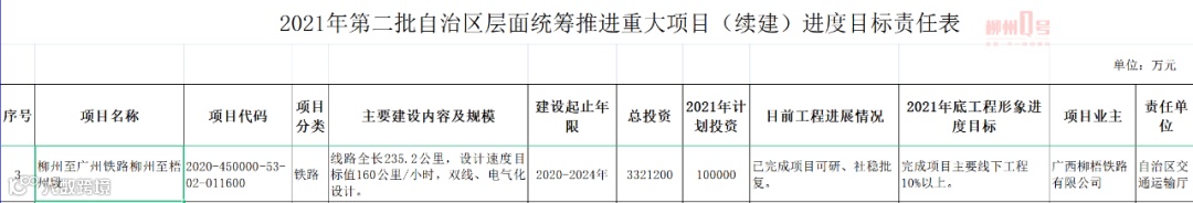 自去年柳州至广州铁路柳州至梧州段开工以来,该项目又有新进展,作为续建项目列入《方案》中,今年计划完成项目主要线下工程10%以上。