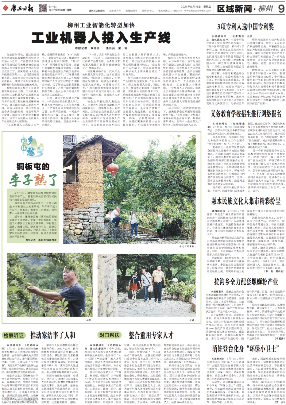 6月16日,《广西日报》区域新闻版整版报道柳州。其中头条刊发《柳州工业智能化转型加快/工业机器人投入生产线》,报道称,从2016年开始,柳州市先后出台多项扶持政策、规划布局产业发展。柳州市工信局发布数据显示,该市工业机器人及机器人产业发展已步入新阶段。
