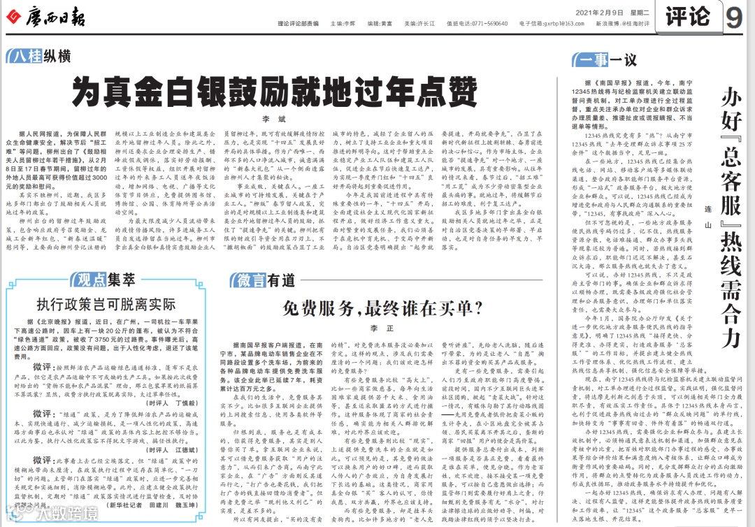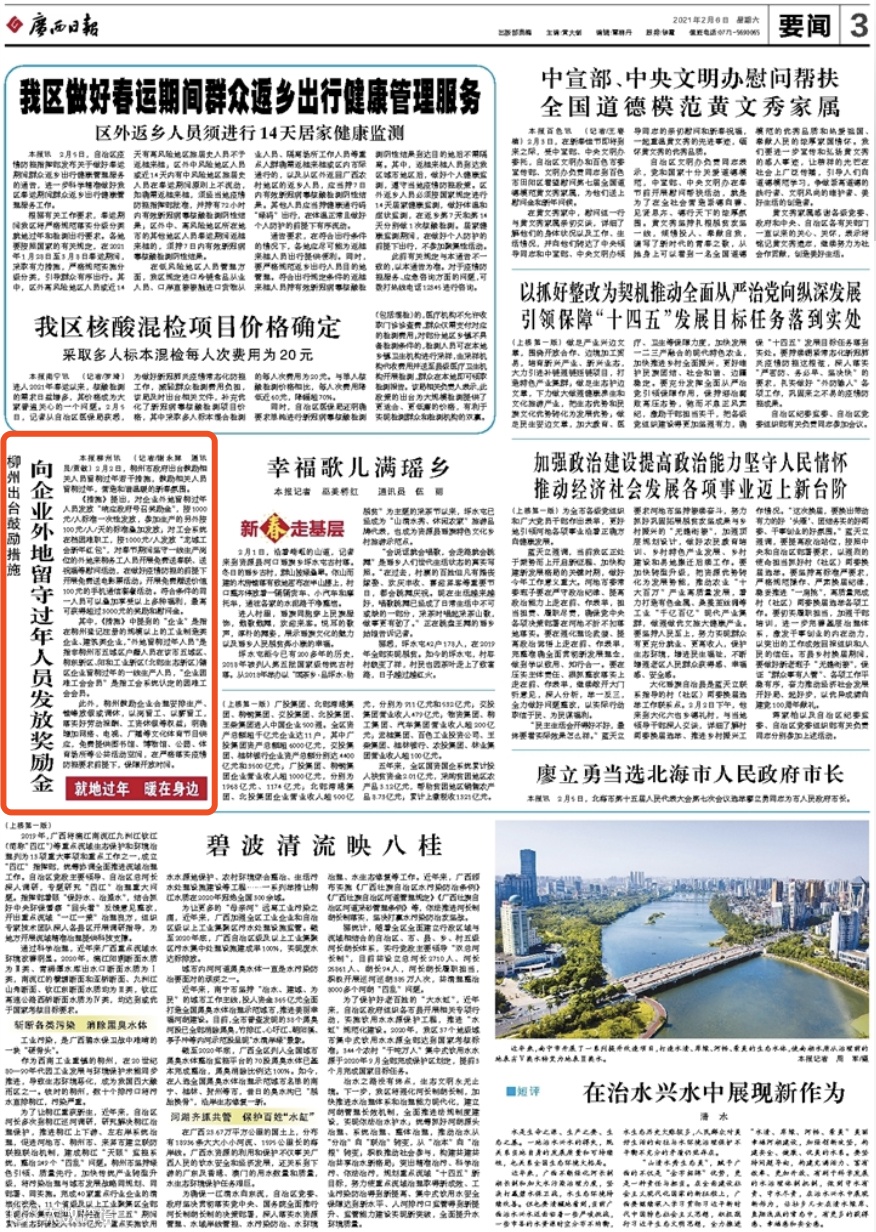 2月9日,《广西日报》评论版头条刊发《为真金白银鼓励就地过年点赞》。评论称,“柳版”春节留人政策,突出的是对规模以上工业制造类和建筑类企业外地留柳过年人员的鼓励,抓住了“提速争先”的关键。柳州把有限的财政引导资金用在刀刃上,不 “撒胡椒面”的鼓励政策凸显了工业城市的特色,减轻了企业留人的压力,树立了支持工业企业和重大项目推进的鲜明导向。拿出真金白银鼓励相关人员就地过年之举,正是对自治区党委决策的早部署、早启动,也是对自身任务的早发力、早落实。