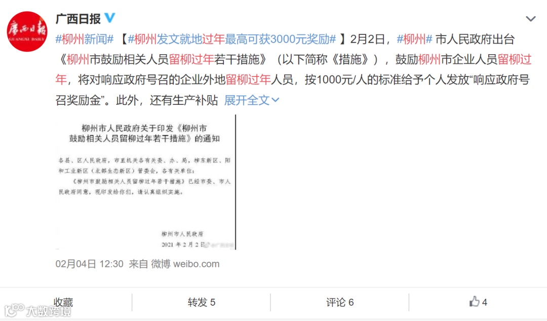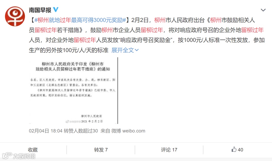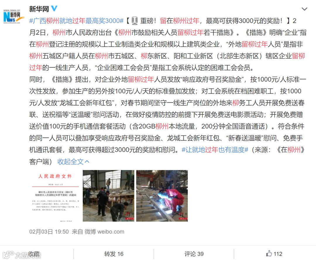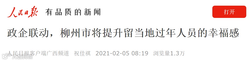 2月2日,柳州市政府出台鼓励相关人员留柳过年若干措施,鼓励相关人员留柳过年,营造和谐温暖的新春氛围。