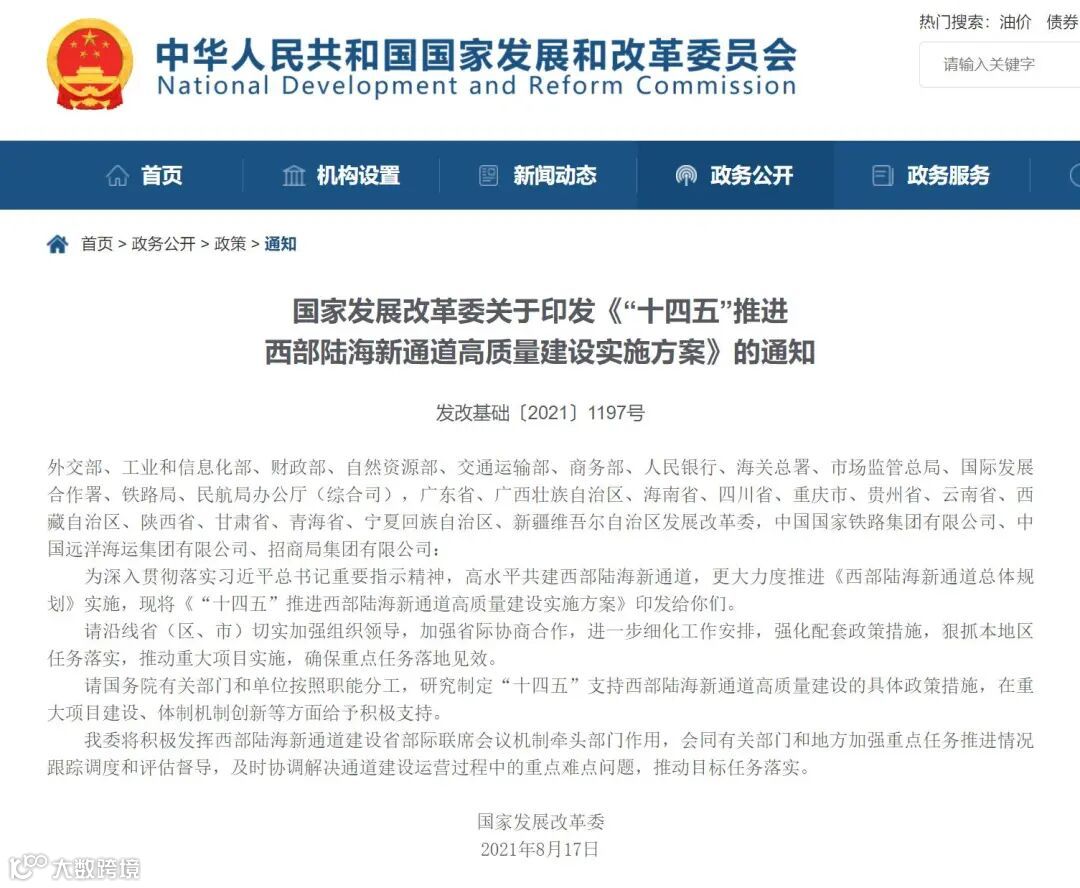 近日,国家发展改革委门户网站正式发布关于《“十四五”推进西部陆海新通道高质量建设实施方案》(以下简称《方案》)的通知,明确了“十四五”时期西部陆海新通道建设的总体目标和重点任务。