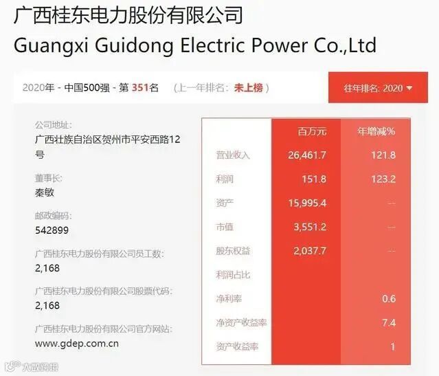 广西桂东电力股份有限公司于1998年12月4日成立。桂东电力成立时承接了母公司正润集团大部分的电源和全部经营性电网资产,形成了全国水利系统地电行业中厂网合一、网架覆盖面最宽最完整、以110KV输电线路环网运行、拥有完整统一的发供电一体化体系,电网内发供电相互配套的地方电力企业。截止2019年12月31日,该公司总资产159.95亿元,净资产20.38亿元,2019年实现营业收入264.62亿元,归属于上市公司股东的净利润15,178.83万元,每股收益0.1834元。