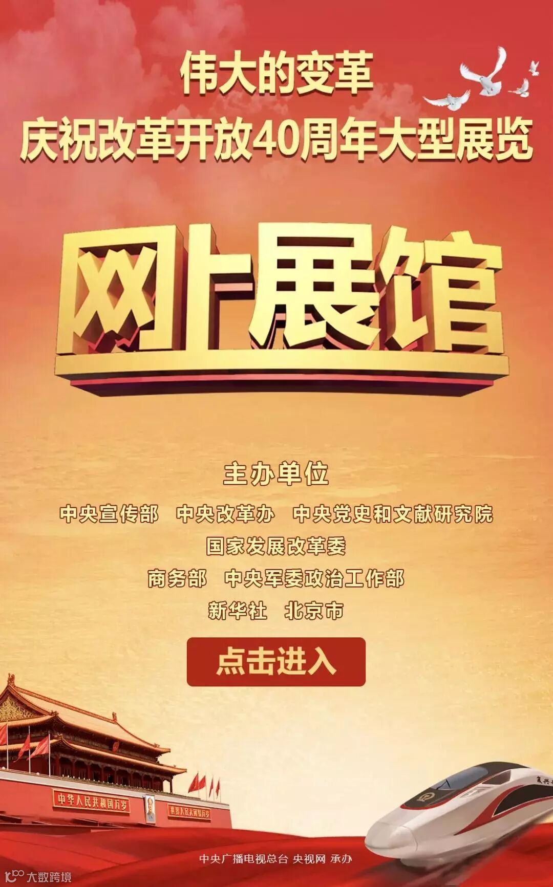 在庆祝改革开放40周年之际,由中共中央宣传部、中央改革办、中央党史和文献研究院、国家发展改革委、商务部、中央军委政治工作部、新华社、北京市共同举办的《伟大的变革——庆祝改革开放40周年大型展览》在国家博物馆开幕。展览对公众开放参观以来,社会各界广泛关注,团体个人踊跃参观。现在,网友们不用去北京,也可以通过网上展馆看展览啦!
