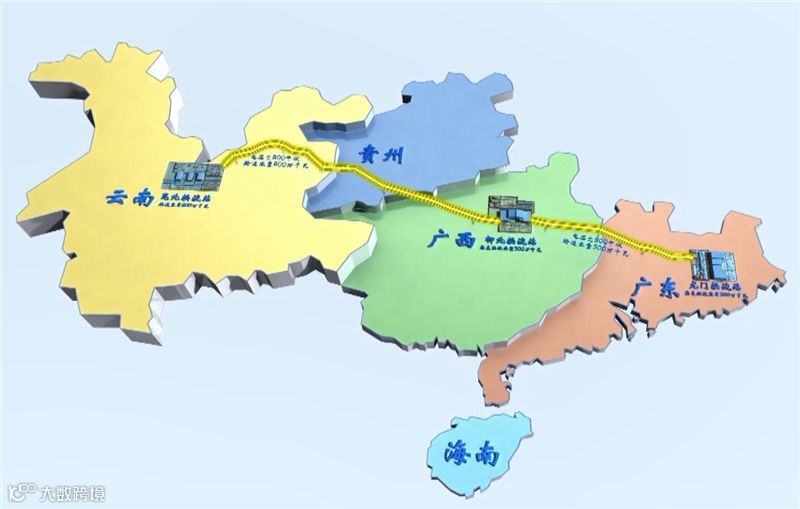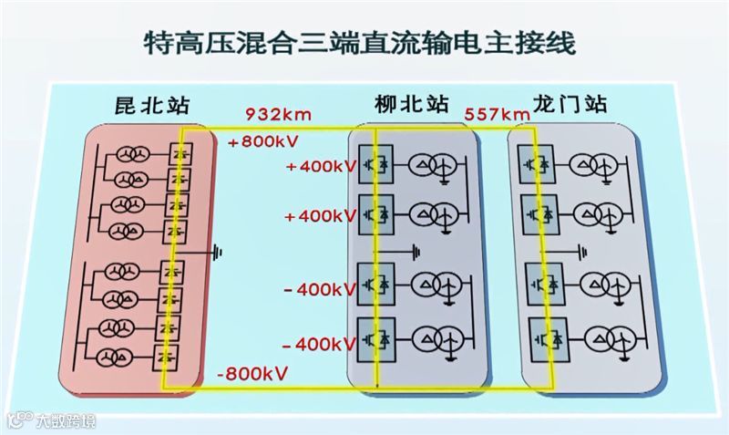 乌东德电站送电广东广西特高压多端直流示范工程,简称“昆柳龙直流工程”,工程采用正负800千伏三端混合直流技术,创造了多项世界第一: