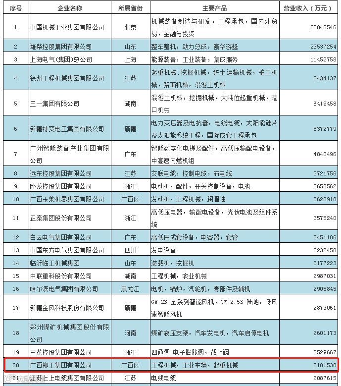 在2018年中国机械工业百强榜单中,广西柳工集团以218.15亿元的营业收入位列第20名