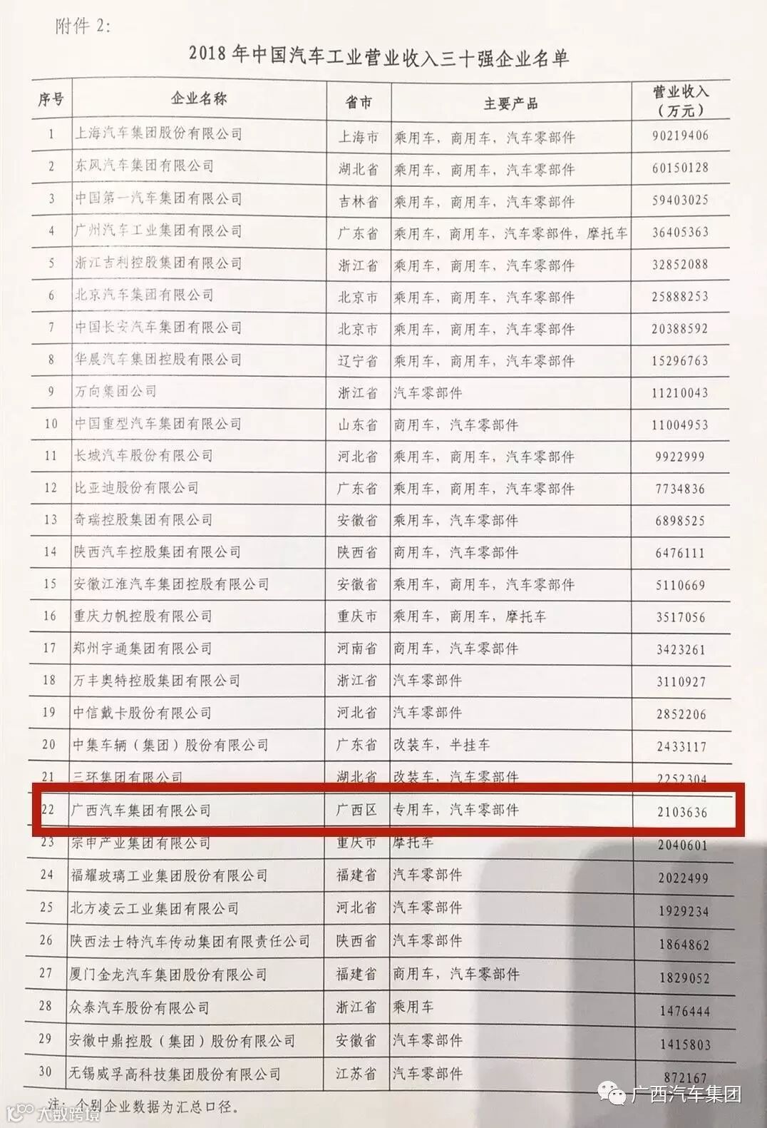 在汽车工业30强榜单中,广西汽车集团以超过210亿元的营业收入排名第22位