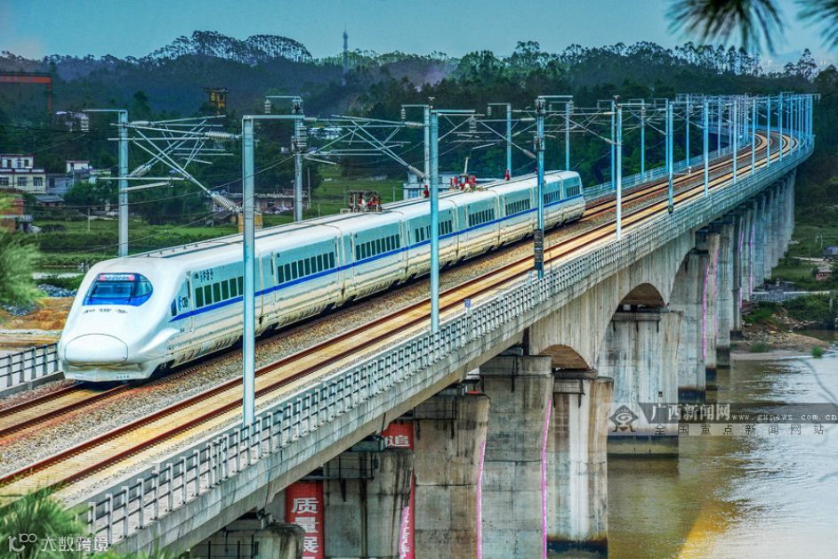 防城港市融入南向通道建设,跨越式发展交通。图为行驶在防城港境内的动车。(资料图)