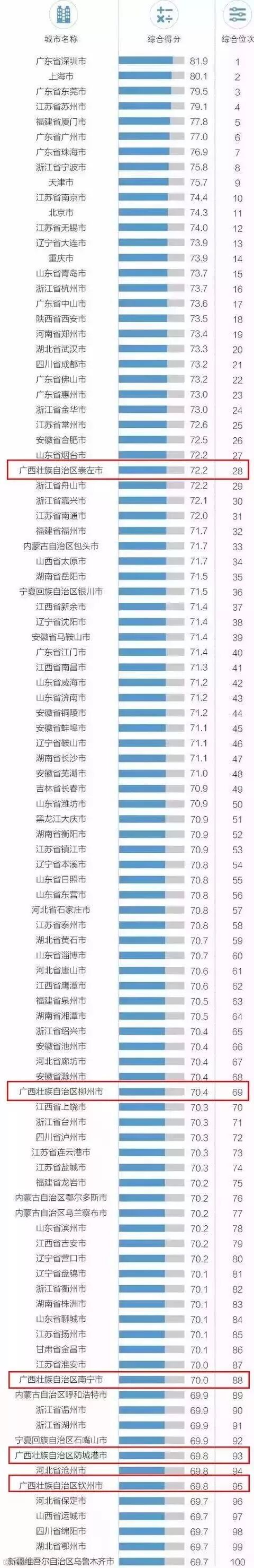 广西的崇左市、柳州市、南宁市、防城港市、钦州市综合得分分别为72.2分、70.4分、70.0分、69.8分和69.8分,分别位列第28、69、88、93、95位。据南宁海关统计,今年上半年,广西外贸进出口1815.9亿元人民币,比去年同期增长4.7%。