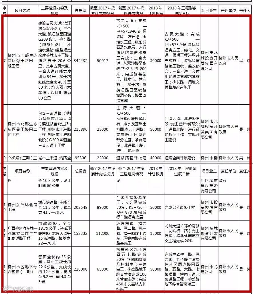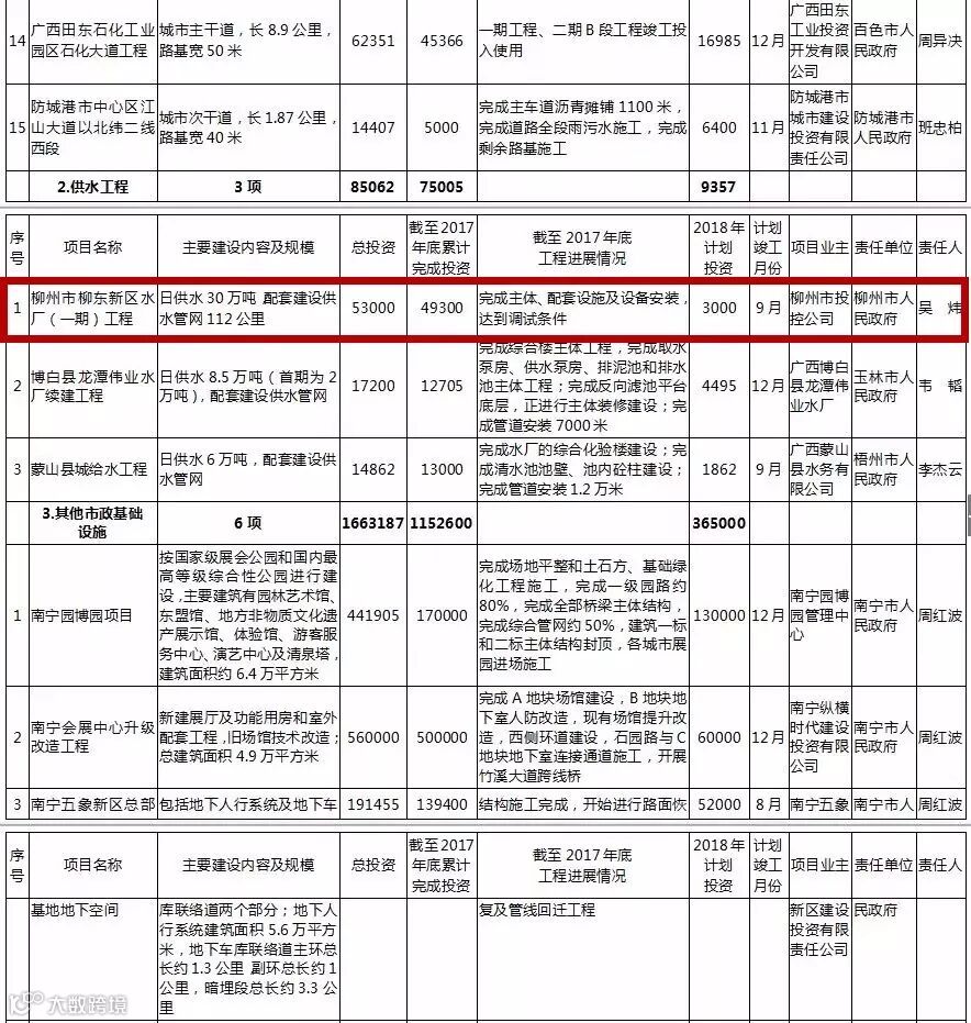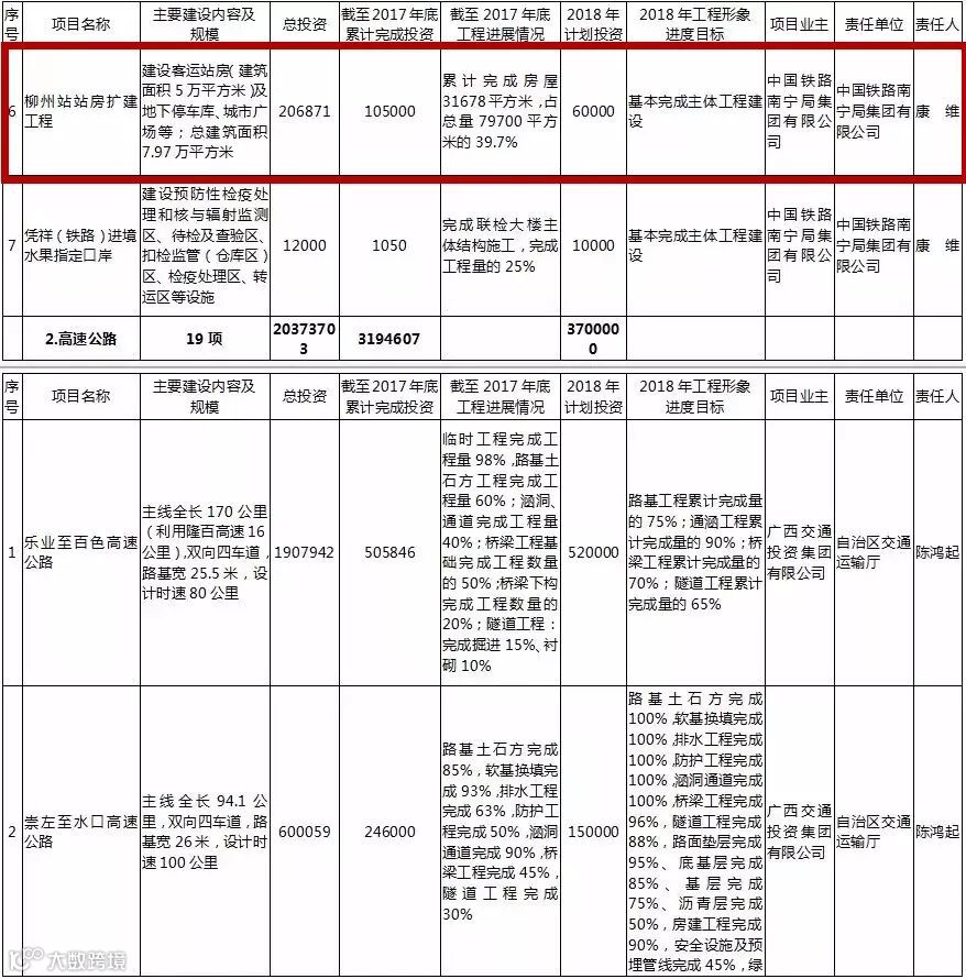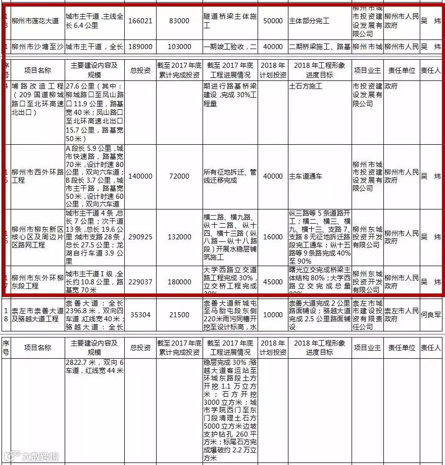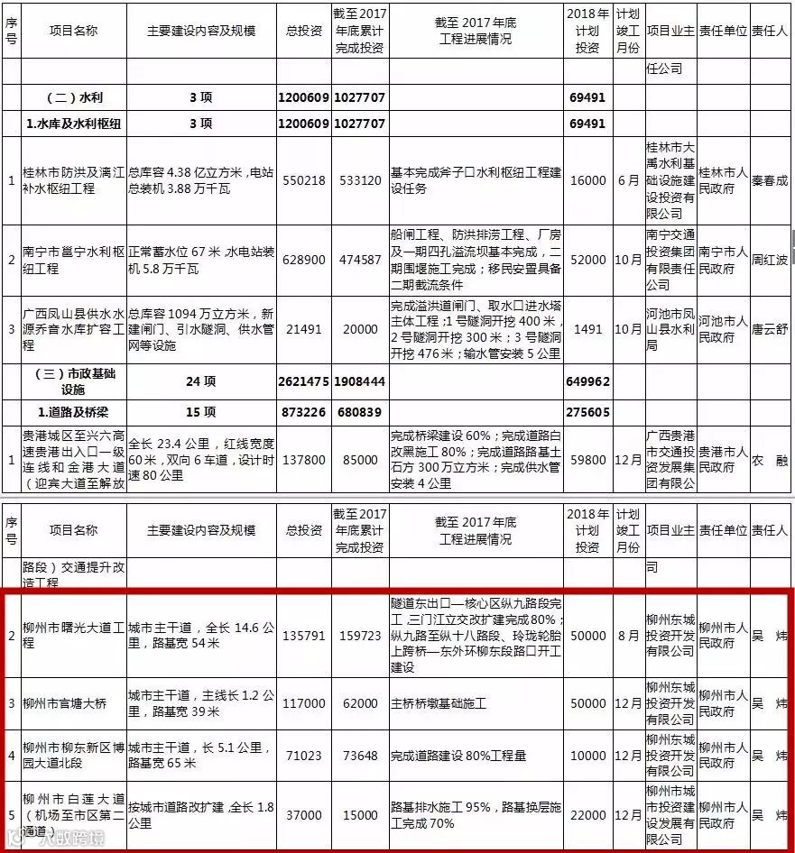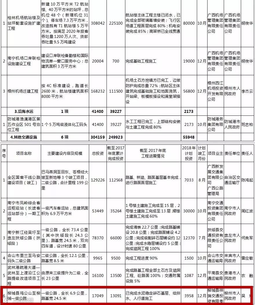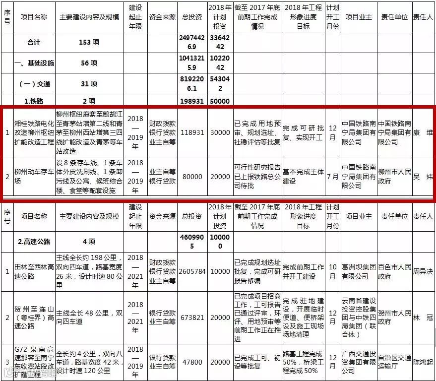 其中,柳州续建项目包括柳州站站房扩建工程、三柳高速融安出口至龙宝大峡谷公路(香粉-安陲段)、柳州国家公路运输枢纽柳东物流中心项目、北部生态新区骨干路网一、二期工程等。