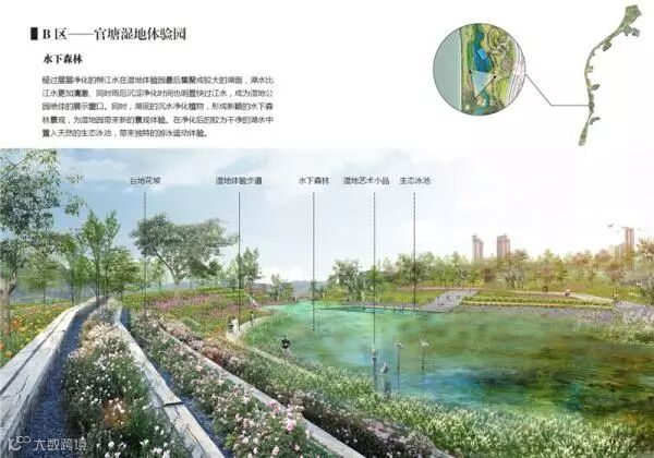 据了解,官塘湿地体验园利用堤外坑、塘、洼地,结合浅流湿地运行机制和生物净化手段,营造重在参与体验的滨江特色景观段。湿地体验园主要分为沉淀与浅流净化段、航模湖与分流净化段及水下森林段三个区段。