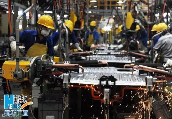 (工人在广西汽车集团有限公司冲焊件厂生产汽车零部件。新华社记者 摄)